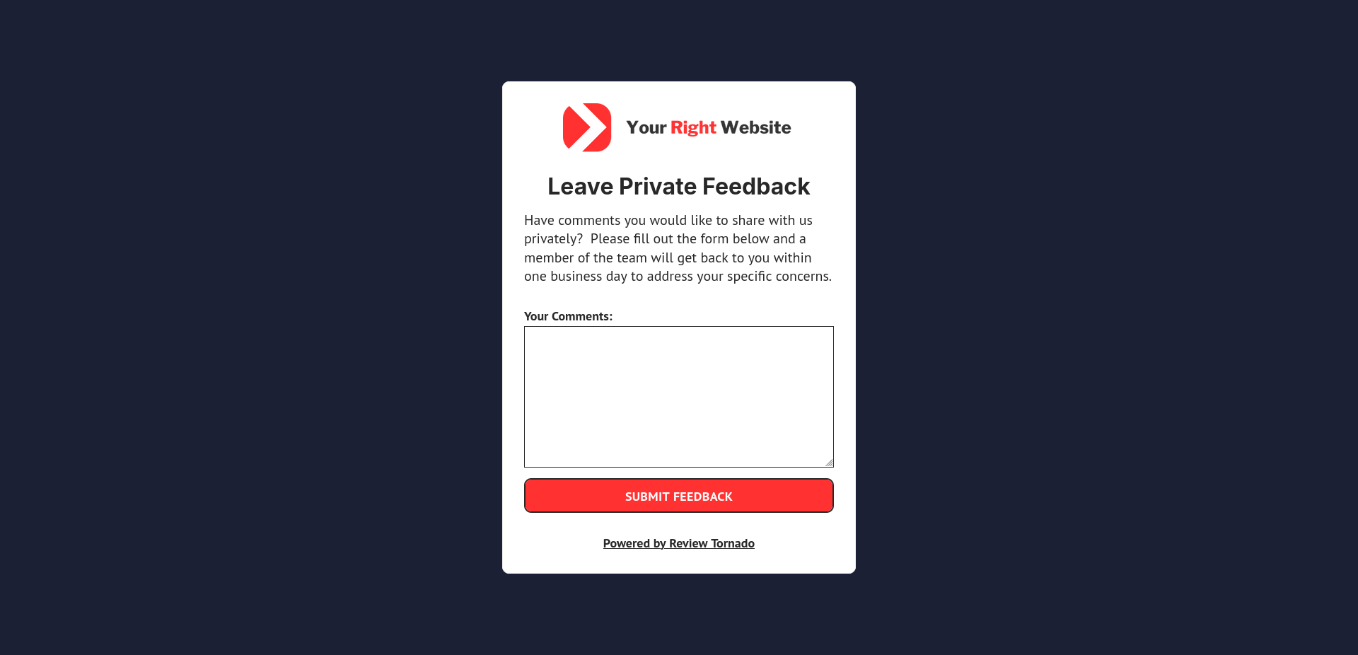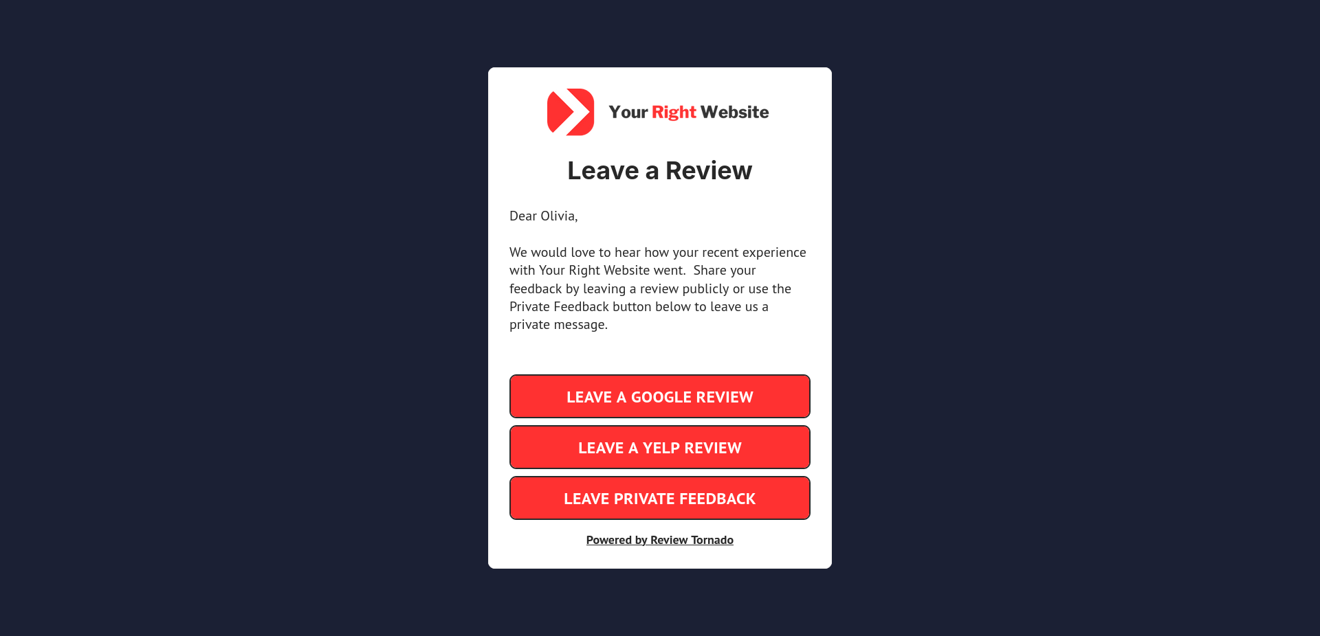 When a customer opens the email sent to them by Review Tornado they have the option to leave Private Feedback for you and your business. This gives an unhappy customer an alternative to leaving a negative review for your business. Best of all, Review Tornado’s Private Feedback feature is designed to avoid Google’s review gating penalties and keep your business on the good side of Google and Yelp while still giving customers an alternative to leaving negative reviews.